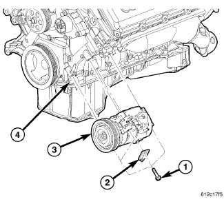 3. Loosely install the bolts (1) that secure the A/C compressor and the automatic transmission cooler line bracket (2), if equipped, to the cylinder block (4).