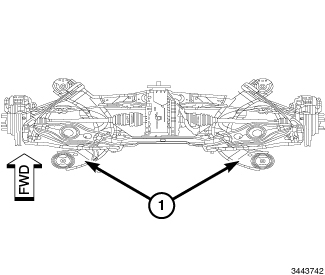 2. Rear - On each side of the vehicle, measure the distance from the cradle frame (1) to the floor or alignment rack/lift runway surface. It may be necessary to measure to the bottom of a straight edge, placed from lift runway to runway, to get an accurate measurement.