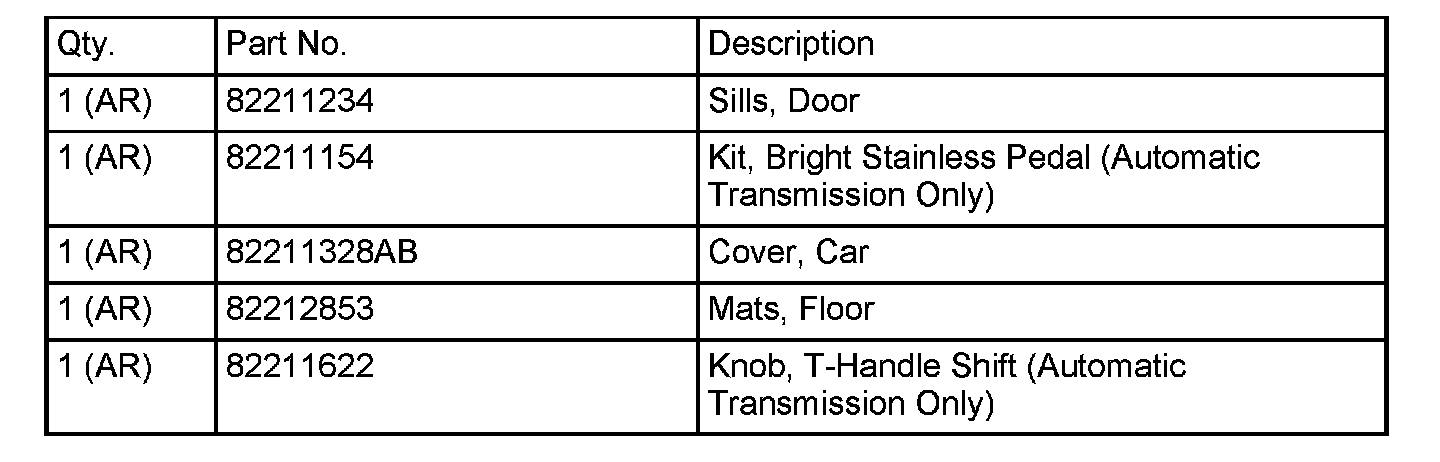 This bulletin applies to vehicles built before February 11, 2011 (MDH 0211XX) equipped with Mopar Interior Appearance Group (sales code ACX).