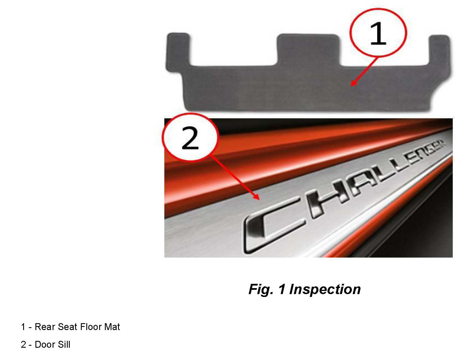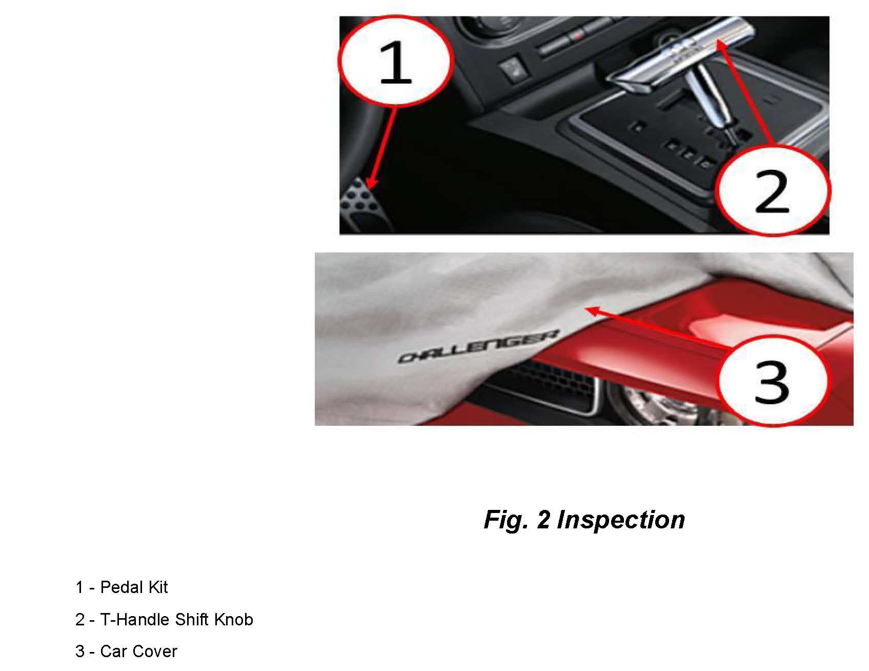 1. Inspect the vehicle for a t-handle shift knob (Automatic Transmission Only) and bright stainless steel pedal kit (Automatic Transmission Only). Additionally inspect for floor mats, car cover, door sills with the challenger logo embroidered or stamped on the part (Fig 1) (Fig 2).