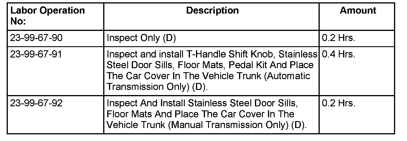 This bulletin involves inspecting for a t-handle shift knob and bright stainless steel pedal kit. Also inspect for floor mats, door sills and a car cover with the challenger logo. If necessary install missing accessories depending on the vehicle transmission.
