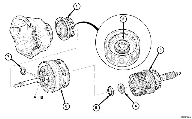 31. Remove multiple-disc pack B3 (2) and spring washer (3) by removing snap-ring (1) in transmission housing. To facilitate removal of the snap-ring (1), compress the multiple-disc pack B3 (2). Note which clutch disc is removed just prior to the spring washer (3) for re-assembly. If the clutch discs are re-used, this disc must be returned to its original position on top of the spring washer.