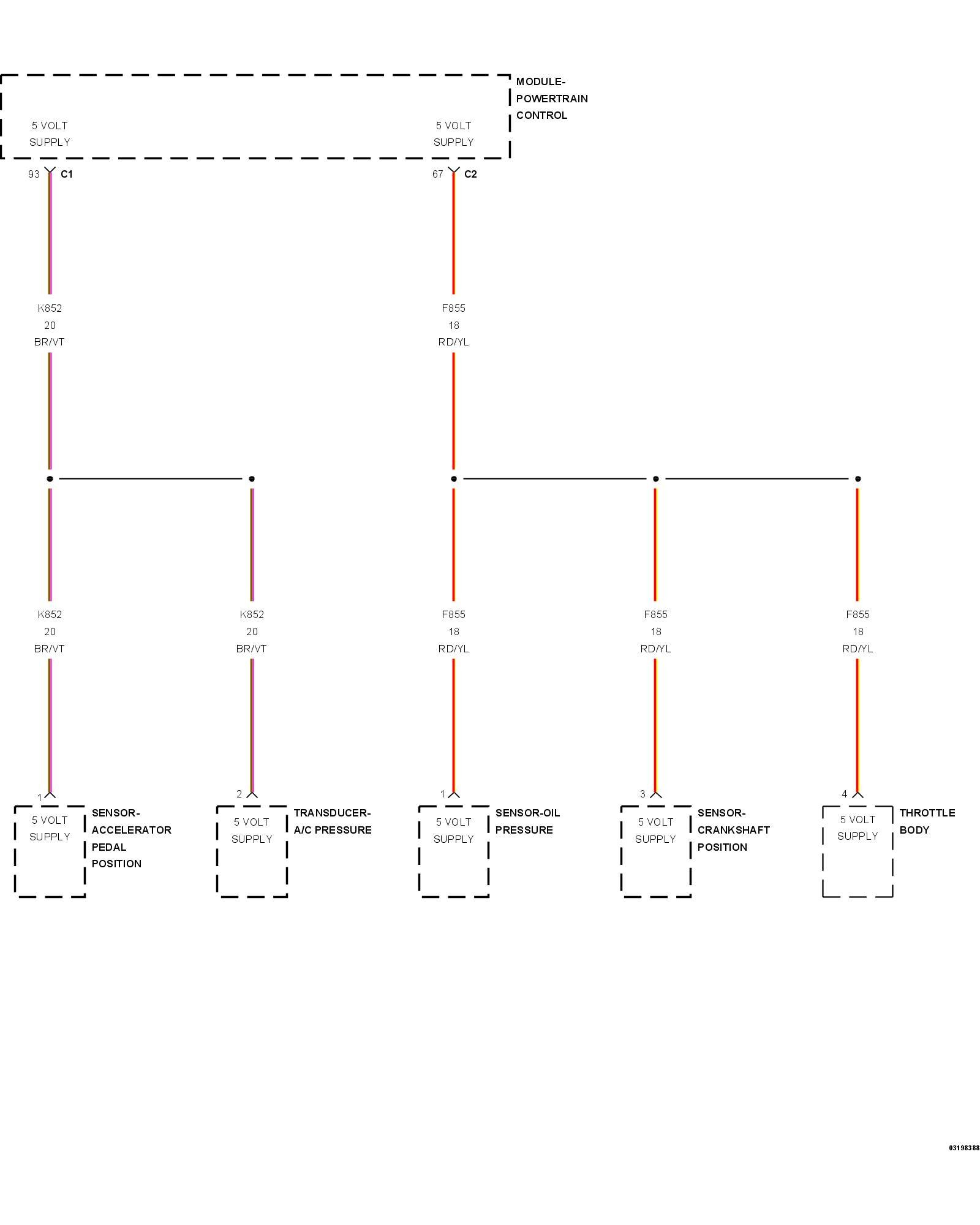 The primary 5-Volt Supply circuit supplies the Crankshaft Position Sensor (CKP), Oil Pressure Sensor (OPS), Throttle Body Assembly, A/C Pressure Transducer, and Accelerator Pedal Position (APP) Sensor 1. For self protection, if the 5-Volt Supply circuit is shorted to ground or if one of the sensors is internally shorted, the Powertrain Control Module (PCM) will turn off the 5-Volt Supply circuit until the next ignition cycle.