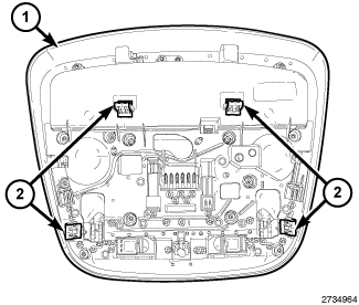 The overhead console assembly (1) is mounted by four snap clips (2) securing it to a molded plastic retainer bracket located above the headliner. The Electronic Overhead Module is secured to the overhead console with screws and is only serviced as an assembly with the overhead console.