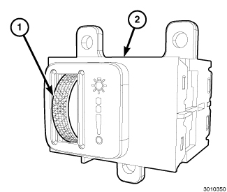 This model uses a separate dimmer module (2) that is located on the instrument panel, in a mounting hole inboard of the headlamp switch mounting hole, outboard of the steering column. The dimmer module features a single thumbwheel (1) for panel lamps dimming and interior lighting control.