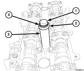 4. Position the spark plug tube (3) on the top half of Spark Plug Tube Installer (2) and assemble the tool on the cylinder head. Make sure there are two thrust washers (4) installed.