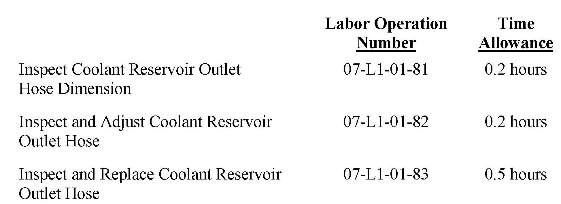The coolant reservoir outlet hose must be inspected at the coolant reservoir (bottle). Hoses found with a dimension that is greater than 0.275 in. (7mm) and cannot be adjusted must be replaced.