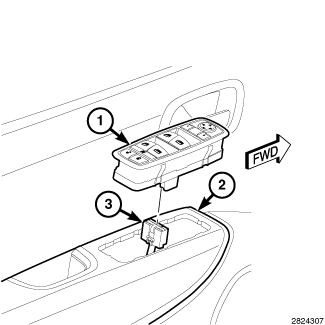 1. Position the front door switch module (1) close enough to the mounting hole in the arm rest (2) of the front door trim panel to access and reconnect the front door wire harness connector (3) to the switch connector receptacle.