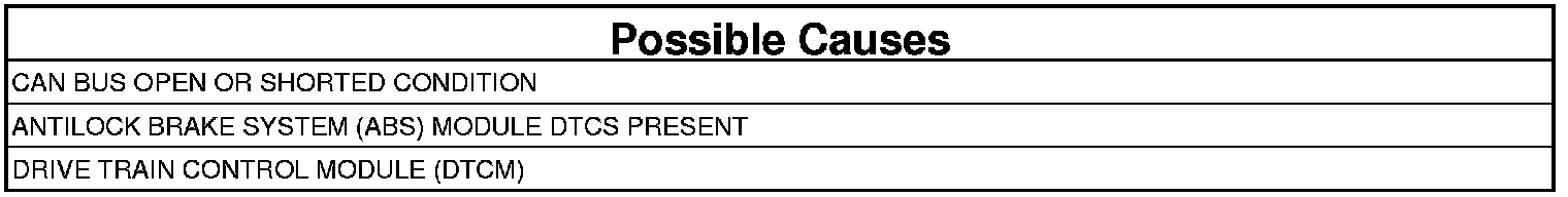 The Drive Train Control Module (DTCM) is receiving implausible data for vehicle speed, wheel speeds, brake switch status, longitudinal acceleration, yaw rate or lateral acceleration from the ABS Module.