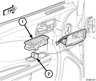 1. Position the front door switch module (1) close enough to the mounting hole in the arm rest of the front door trim panel to access and reconnect the front door wire harness connector (2) to the switch connector receptacle.