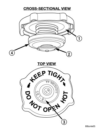 All cooling systems are equipped with a pressure cap on the radiator. This cap releases pressure at some point within a range of 110-138 kPa (16-20 psi). The pressure relief point (in pounds) is engraved on top of the cap (3).