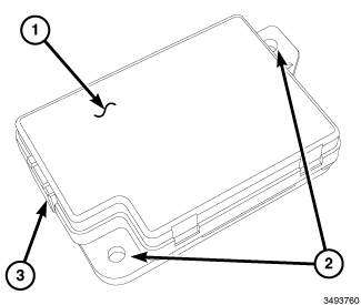 The Remote Compass Module (RCM) (1) is secured through two integral mounting tabs (2) to a mounting bracket that is secured to the upper center of the instrument panel support structure, behind the Integrated Center Stack (ICS) display module. A connector receptacle (3) integral to one side of the molded black plastic RCM housing is connected to the vehicle electrical system through a dedicated take out and connector of the instrument panel wire harness.