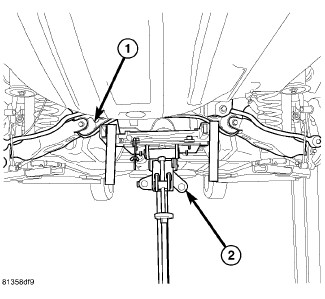 9. Position under-hoist utility jack or transmission jack (2) under rear axle (1). Raise jack head to contact rear axle and secure in place.