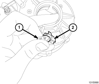 9. Install Clutch Coil Wire Terminal Ends into the Clutch Coil Harness Connector (2), engage the Terminal Ends in the Tabs, then install the Cover (1).