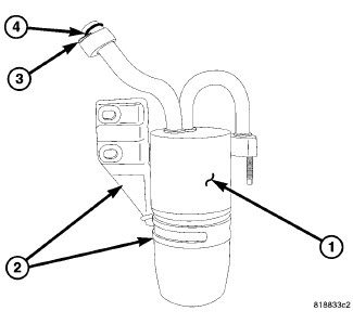 The A/C accumulator is mounted below the engine compartment behind the right side of the front fascia. A band and mounting bracket (2) secures the A/C accumulator to the right front frame rail and the connections are sealed by use of metal gaskets (3) and rubber O-rings (4).