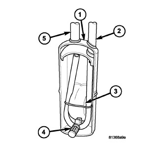 Refrigerant enters the A/C accumulator (1) mostly as a low pressure vapor through the inlet tube (2). Any liquid, oil-laden refrigerant falls to the bottom of the canister, which acts as a separator. A desiccant bag (3) is mounted inside the accumulator canister to absorb any moisture which may have entered and become trapped within the refrigerant system. A filter (4) is also mounted inside the canister to trap any foreign material that may have entered the refrigerant system during assembly. The low pressure vapor exits the A/C accumulator through the outlet tube (5).