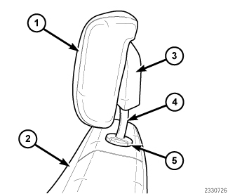 Active Head Restraint (AHR) units are standard equipment for both front seating positions in this vehicle. One AHR unit is located atop each front seat back (2). An AHR can be readily distinguished from a non-active head restraint by the two-piece construction used for an AHR. The forward-facing pad (1) consists of a molded reinforced plastic convex form covered with a dense foam pad and is trimmed in a material coordinated with the other soft trim on the seat. The rearward-facing surface is equipped with a hard molded plastic trim cover (3) that matches the other hard trim on the seat.
