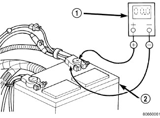 2. Connect the positive lead of the voltmeter (1) to the battery (2) positive terminal post. Connect the negative lead of the voltmeter (1) to the battery (2) positive cable terminal clamp. Rotate and hold the ignition switch in the Start position. Observe the voltmeter. If voltage is detected, correct the poor connection between the battery positive cable terminal clamp and the battery positive terminal post.