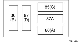 1. A relay in the de-energized position should have continuity between terminals 87A and 30, and no continuity between terminals 87 and 30. If OK, go to 2. If not OK, replace the faulty relay.