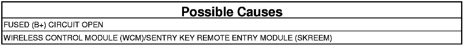 The Sentry Key remote Entry Module (SKREEM) also known as the Wireless Control Module (WCM) has detected the Fused (B+) input voltage below 9 volts with the Key in any position except for RUN.