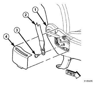 3. Using trim stick or equivalent, remove the seat belt anchor trim (4).
