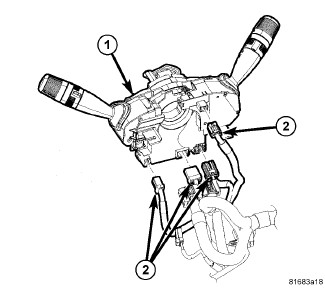 7. Connect the wiring harness connectors (2) to the Steering Column Control Module (SCCM) (1).