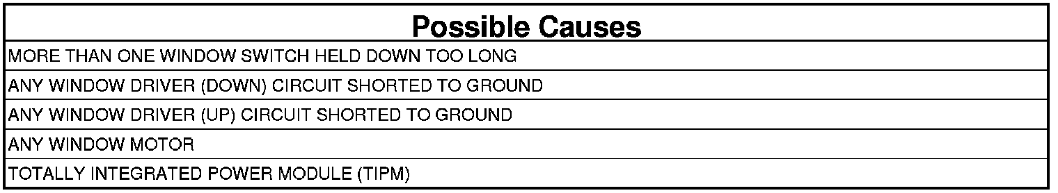 NOTE: A possible cause for this DTC to set would be if the driver held more than one window switch down for an extended period of time thereby causing the high side driver, in the TIPM, to overheat and cut out. Once the high side driver is opened, it will remain open until the next key cycle. However, the code will remain as stored.