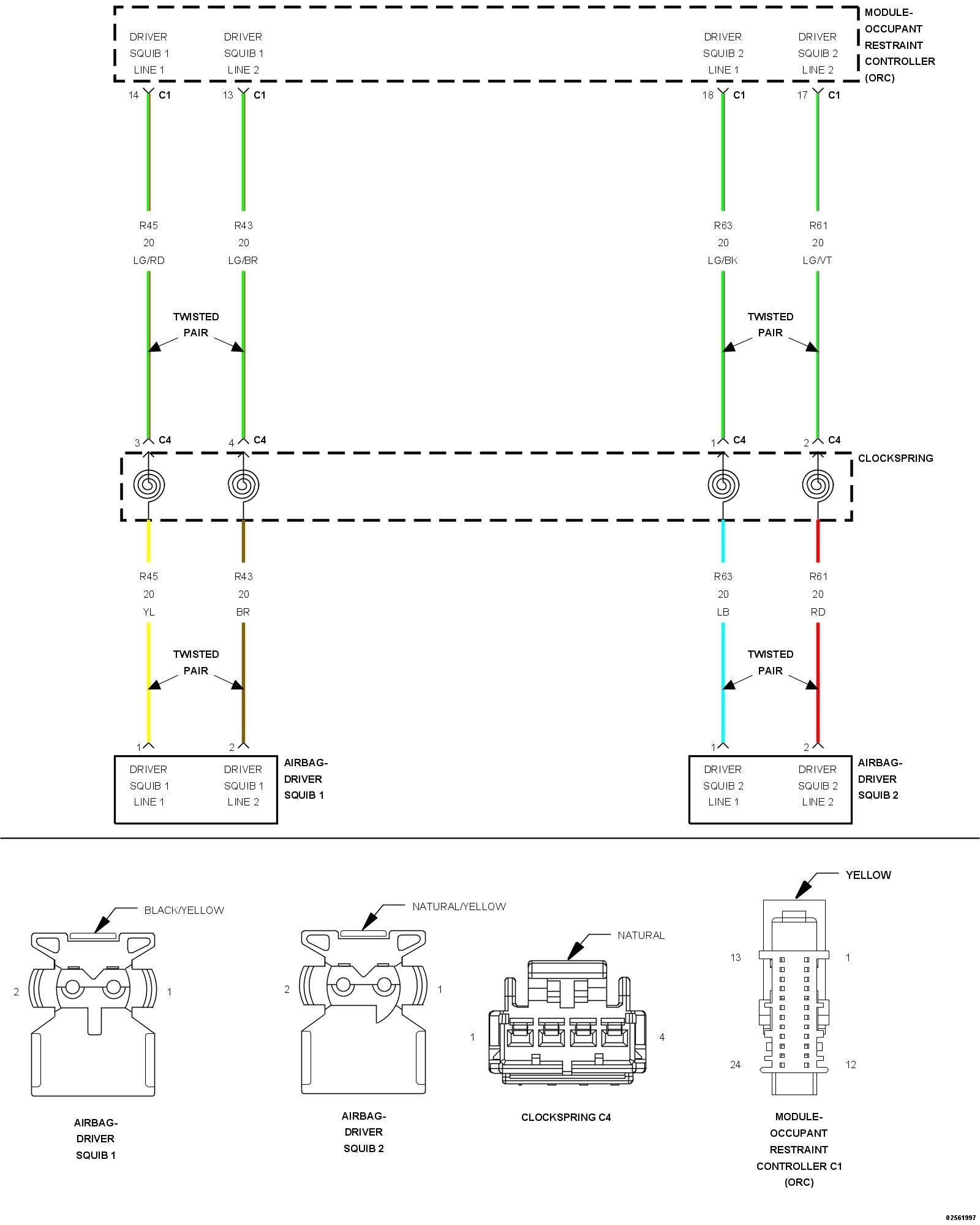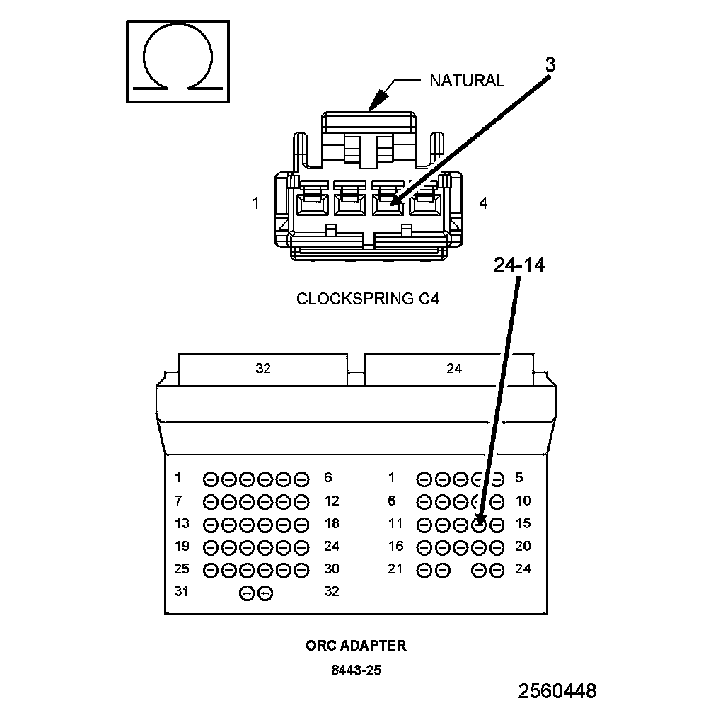 1. Measure the resistance of the (R45) Driver Squib 1 Line 1 circuit between the Clockspring C4 connector cavity 3 and the SRS Load Tool Adaptor cavity 24-14.