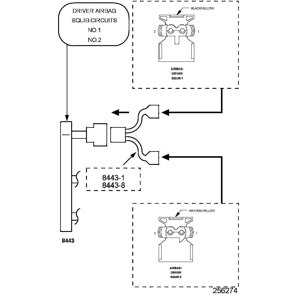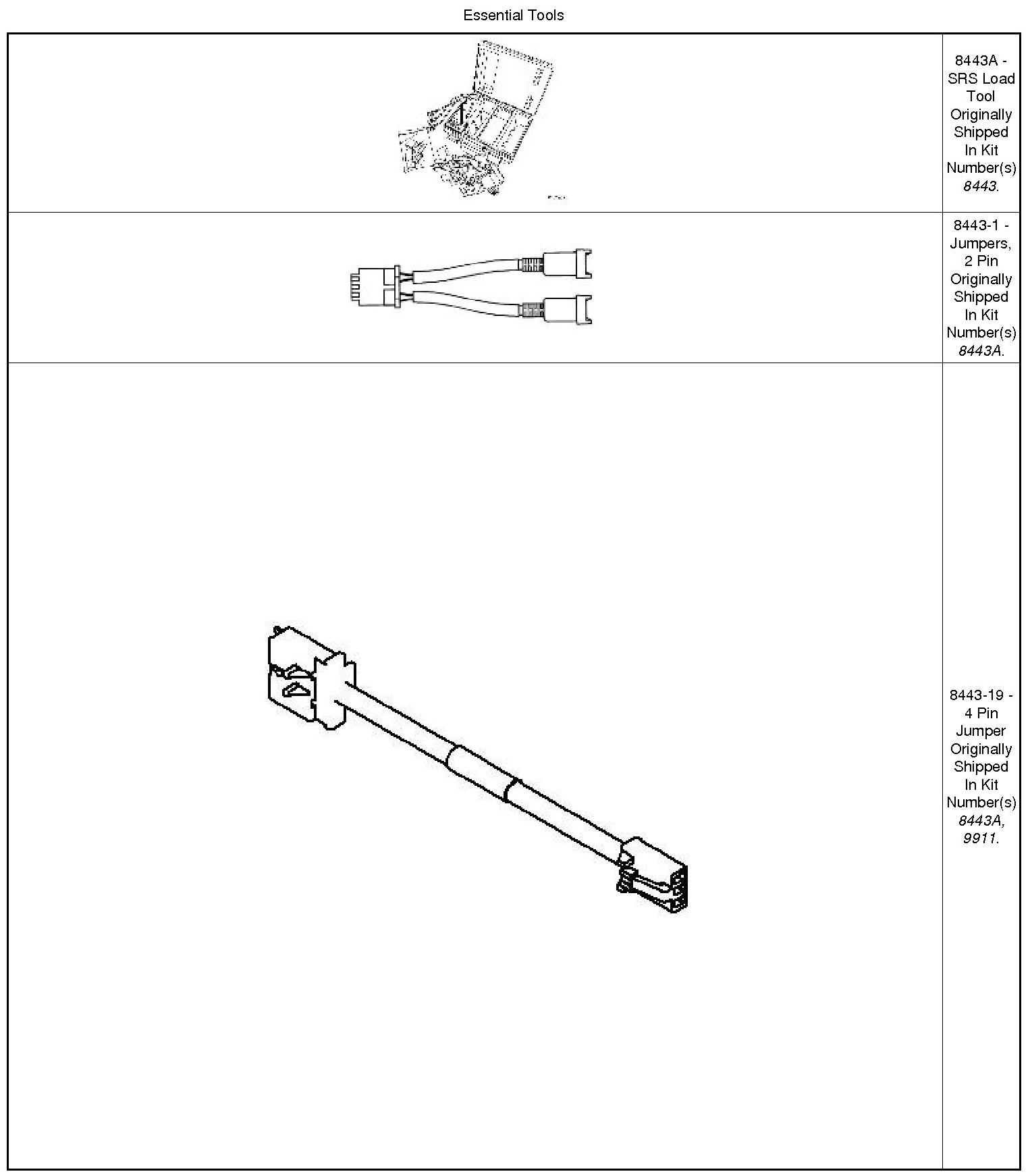 When powered, the Occupant Restraint Controller (ORC) sends a test current to the squibs to verify the integrity of the squib and the wiring. These circuits are maintained in a "floating" configuration at the module, (connected to neither power nor ground), as protection against inadvertent deployment. Use of the Supplemental Restraints System (SRS) Load Tool Kit 8443A in the tests below substitutes a suspect squib with a known good component. The use of the SRS Load Tool Adapter tool provides a test point, as well as a method for opening the shorting bar connections within the harness connector.