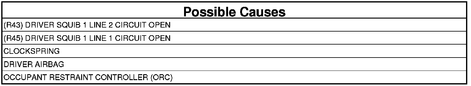 - Repair the (R45) Driver Squib 1 Line 1 circuit for an open.