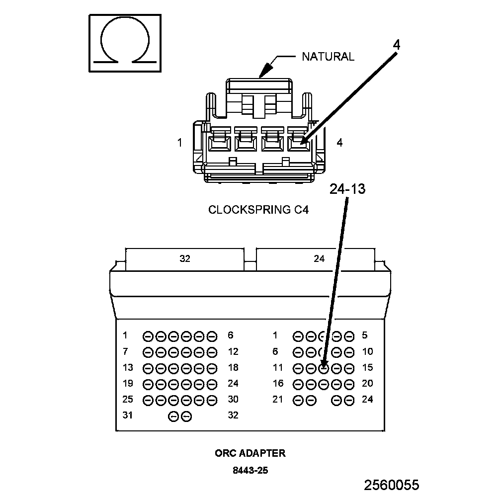 4. Measure the resistance of the (R43) Driver Squib 1 Line 2 circuit between the Clockspring C4 connector cavity 4 and the SRS Load Tool Adaptor cavity 24-13.