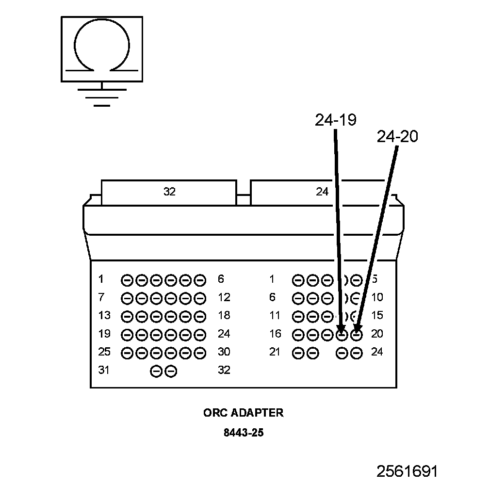 4. Measure the resistance of the (R64) Passenger Squib 2 Line 1 circuit between SRS Load Tool Adaptor cavity 24-19 and ground.