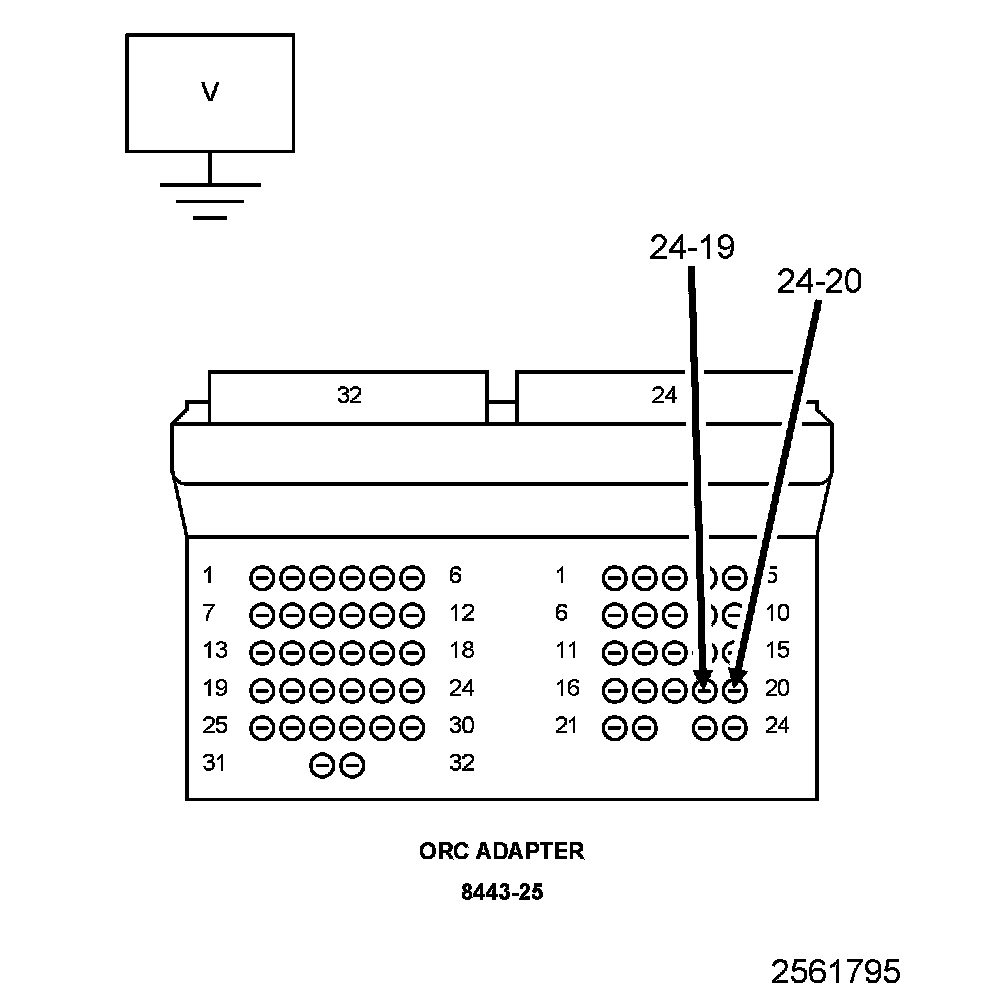 5. Measure the voltage of the (R62) Passenger Squib 2 Line 2 circuit between the SRS Load Tool Adaptor cavity 24-20 and ground.