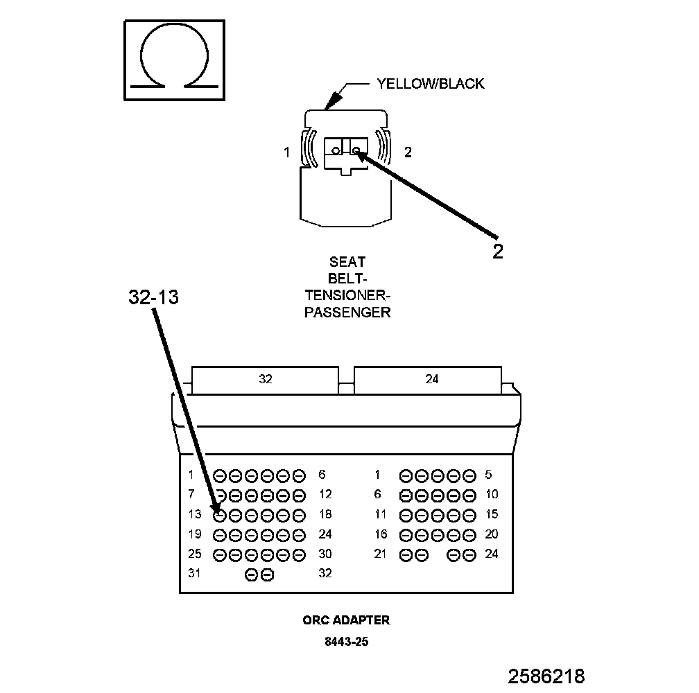 4. Measure the resistance of the (R56) Passenger Seat Belt Tensioner Line 1 circuit between the Passenger Seat Belt Pretensioner connector cavity 2 and the SRS Load Tool Adaptor cavity 32-13.