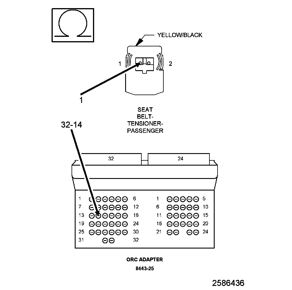 1. Measure the resistance of the (R54) Passenger Seat Belt Tensioner Line 2 circuit between the Passenger Seat Belt Pretensioner connector cavity 1 and the SRS Load Tool Adaptor cavity 32-14.