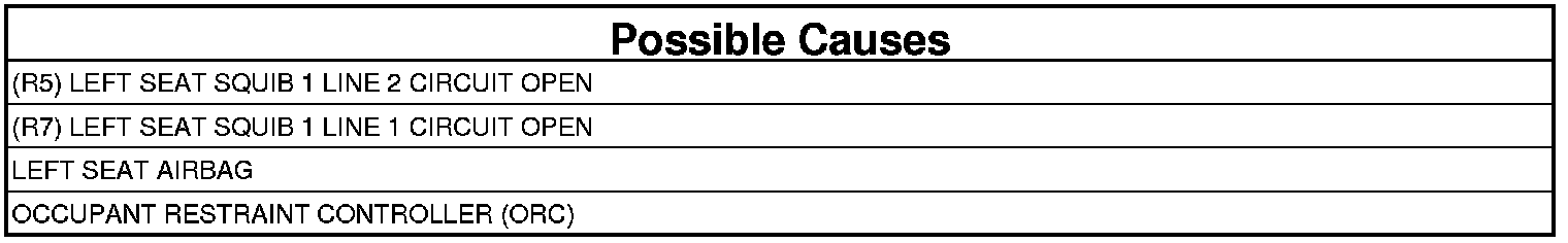 - Repair or Replace the (R5) Left Seat Squib 1 Line 2 circuit for an open or high resistance.