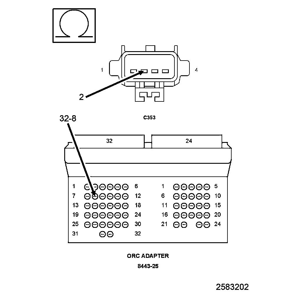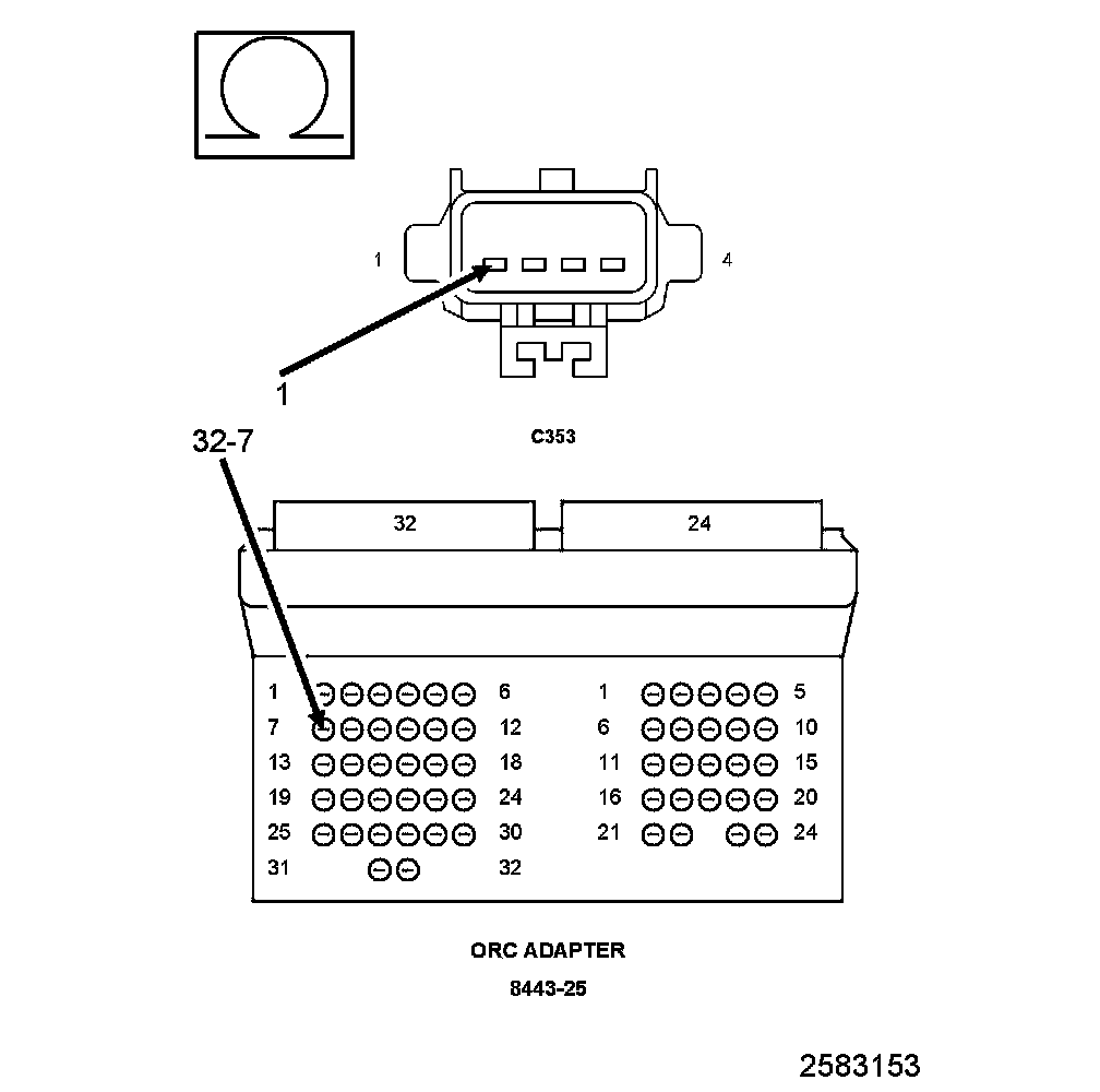 1. Measure the resistance of the (R7) Left Seat Squib 1 Line 1 circuit between the SRS Load Tool Adaptor cavity 32-8 and the C353 in-line connector (body side) cavity 2.
