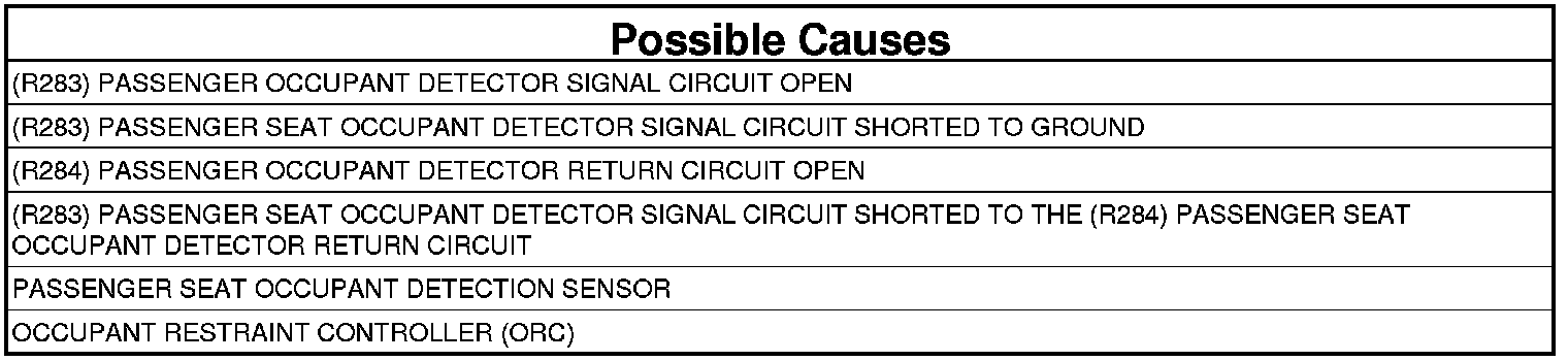 - Repair the (R283) Passenger Seat Occupant Detector circuit for a short to ground.