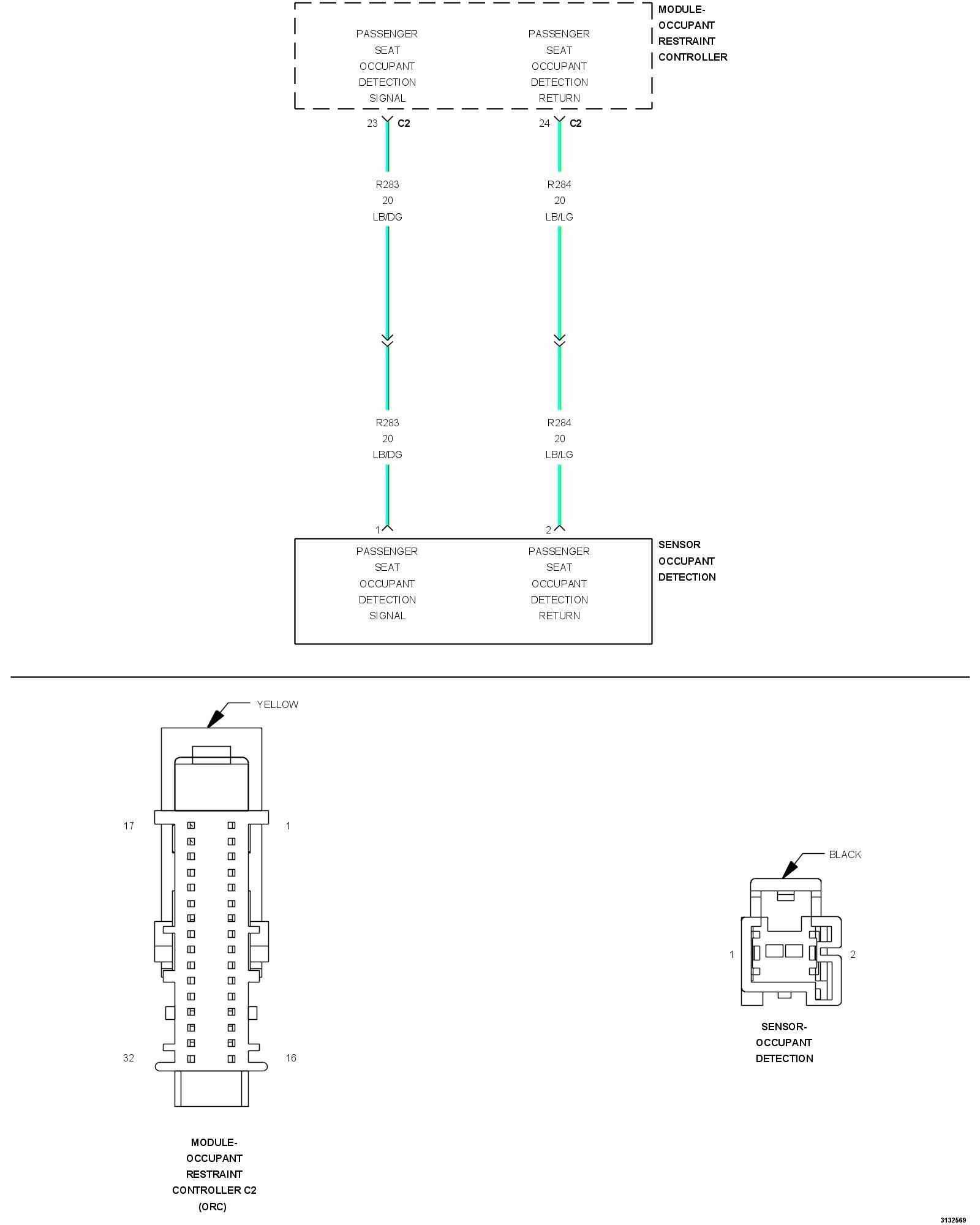- Repair the short to voltage in the (R283) Passenger Occupant Detector Signal Circuit located between the passenger underseat connector and the Passenger Occupant Detector Sensor connector.