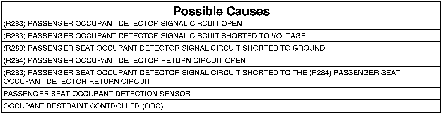 The ORC detects High voltage on the (R283) Passenger Occupant Detector Sensor Signal circuit for 2.5 - 5 seconds. The DTC will not latch for the entire ignition cycle. The code goes from Active to Stored 2.5 - 5 seconds after the code setting criteria is gone. This code also covers the Open fault.