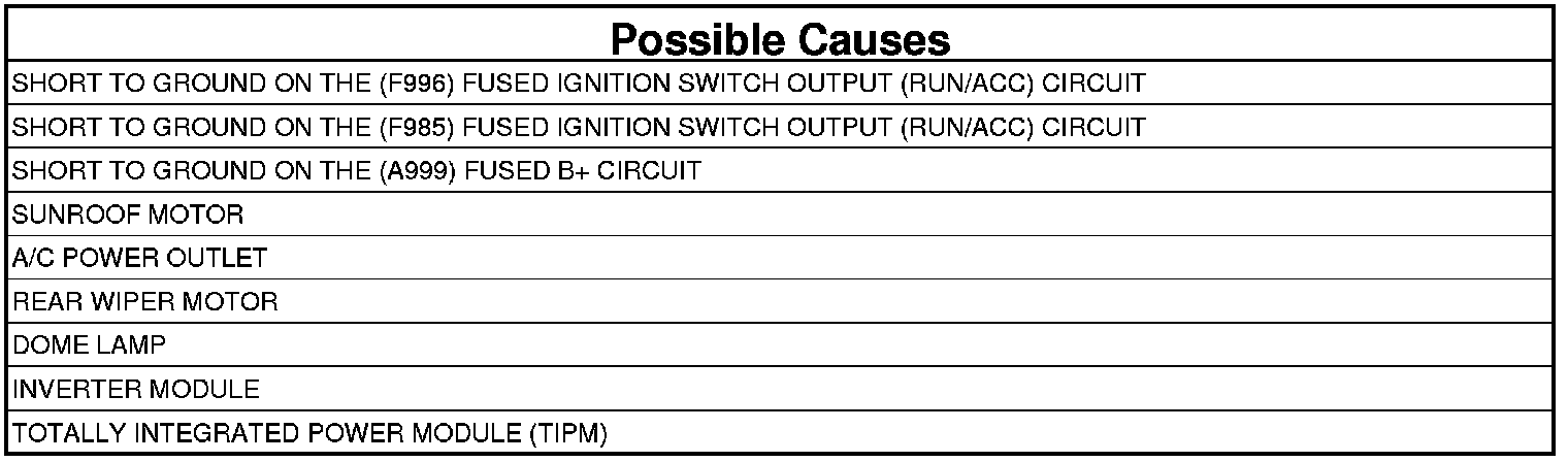 - Repair the (F996) Fused Ignition Switch Output (Run-Acc) circuit for a short to ground.