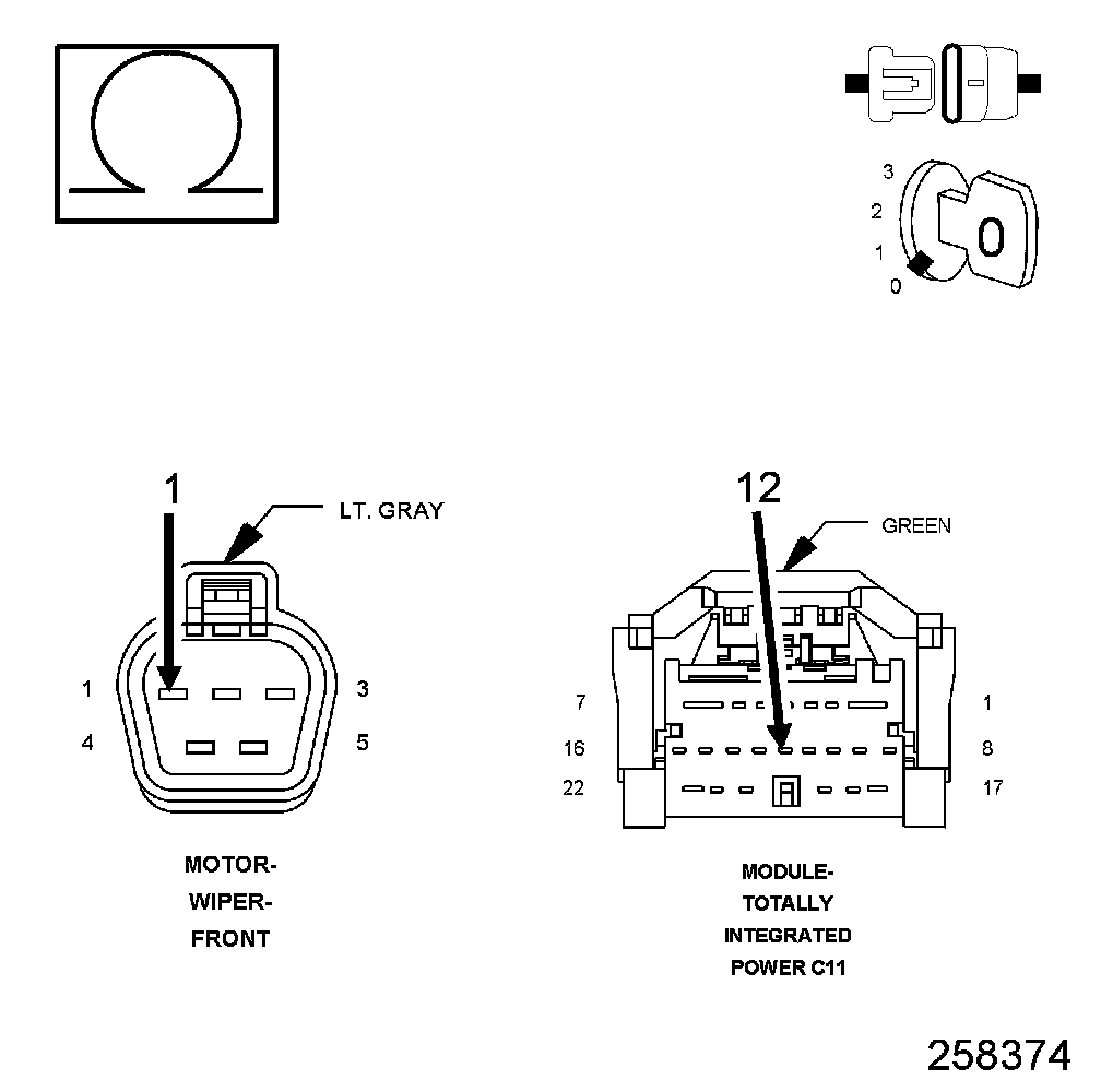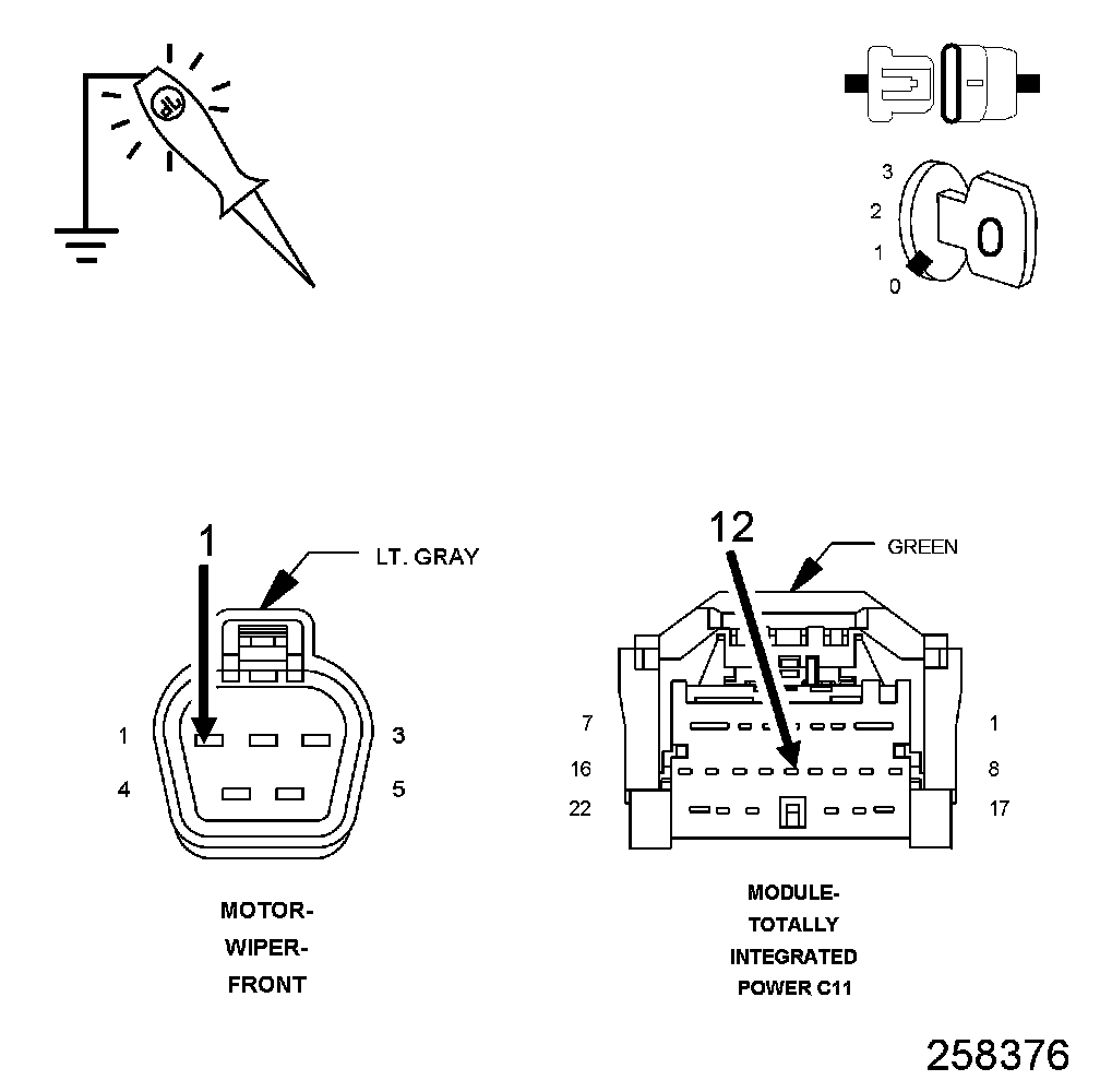 4. Using a 12-volt test light connected to ground, check the Fused Accessory Relay Output circuit in the Front Wiper Motor harness connector.
