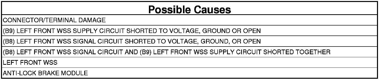 - Repair the (B8) Left Front WSS Signal circuit for a short to voltage.