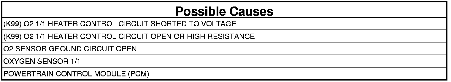 - Repair the (K99) O2 1/1 Heater Control circuit for a short to voltage.