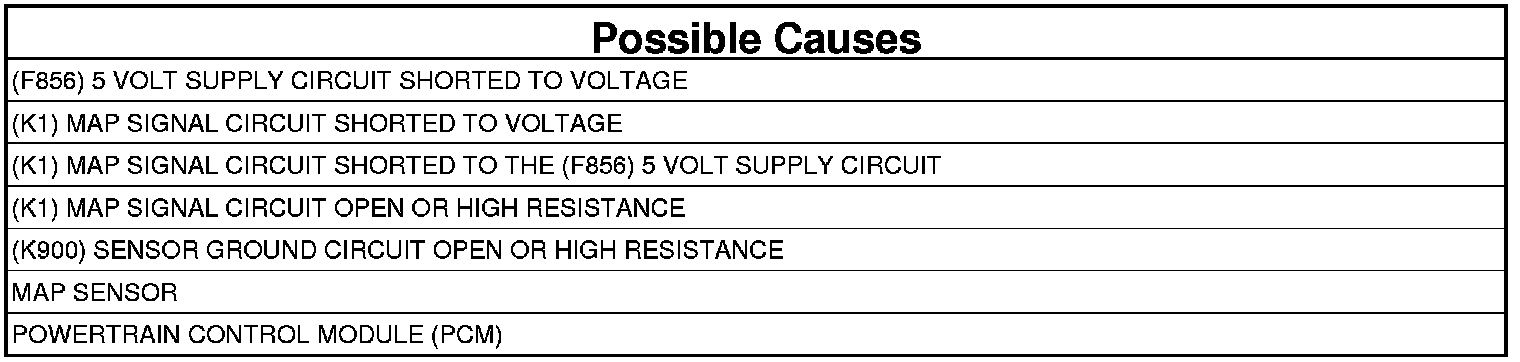 - Repair the (K1) MAP Signal circuit for a short to the (F856) 5 Volt Supply circuit.
