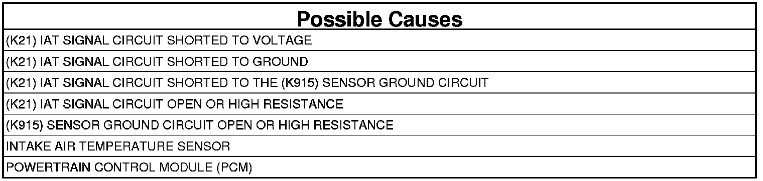 - Repair the (K21) IAT Signal circuit for a short to the (K915) Sensor Ground circuit.