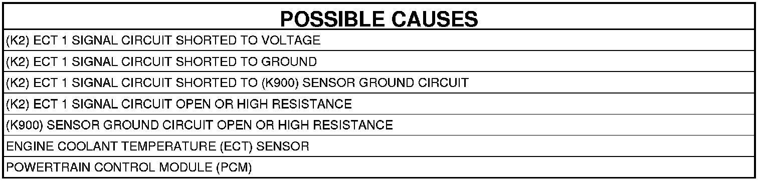 - Repair the (K2) ECT 1 Signal circuit for a short to the (K900) Sensor Ground circuit.