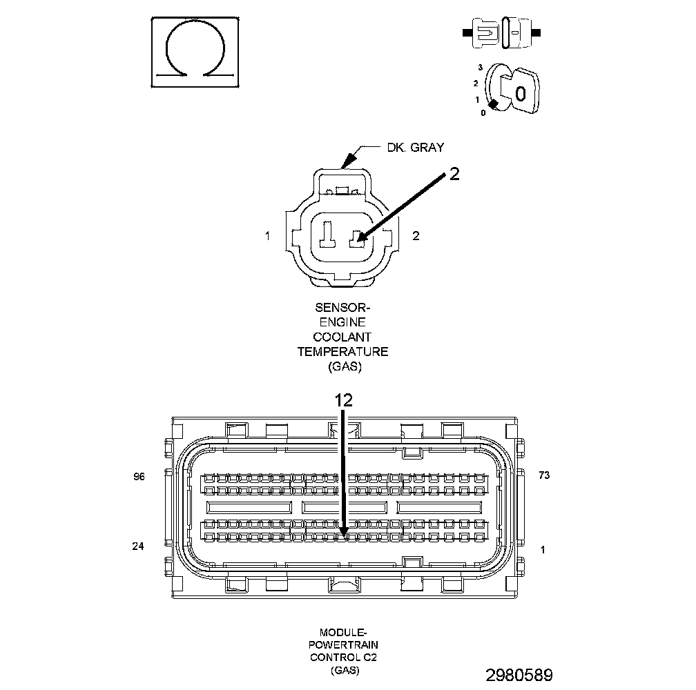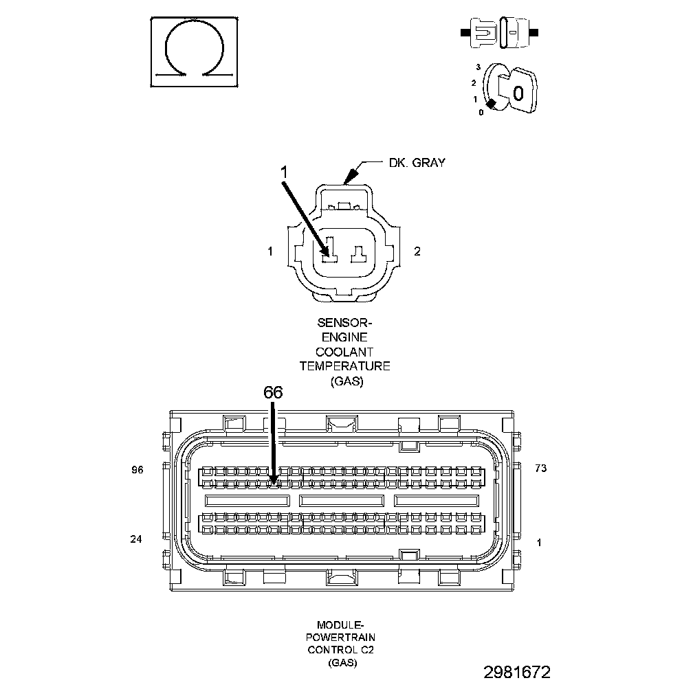 1. Using the wiring diagram/schematic as a guide, inspect the wiring and connectors between the Engine Coolant Temperature Sensor 1 and the Powertrain Control Module (PCM).