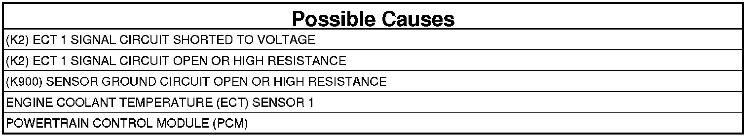 - Repair the (K2) ECT 1 Signal circuit for a short to voltage.