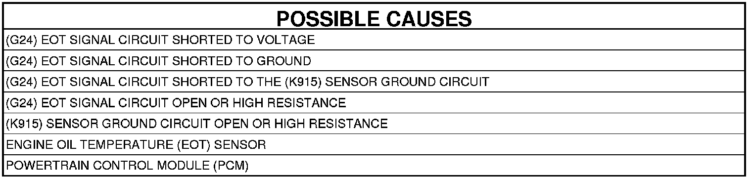 1. Measure the resistance of the (G24) EOT Signal circuit between the Engine Oil Temperature Sensor harness connector and the Powertrain Control Module (PCM) harness connector.